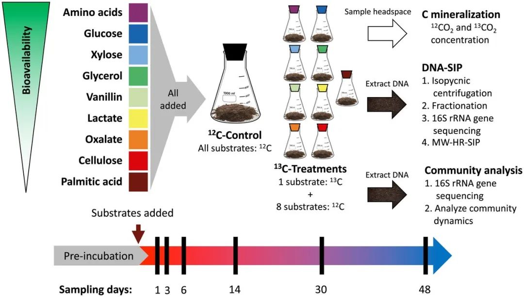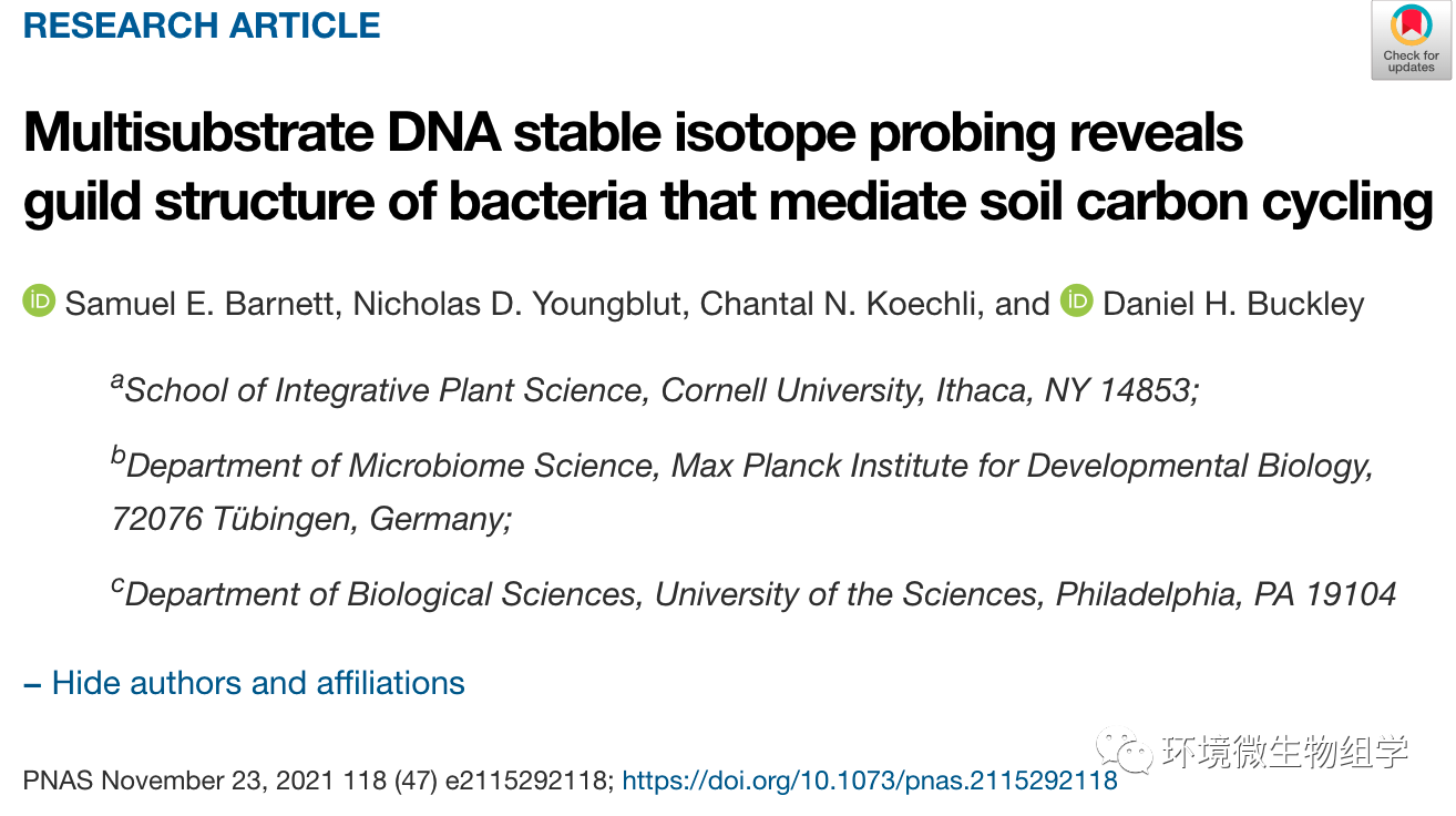 ? ? ??2021年11月23日,權(quán)威綜合學(xué)術(shù)期刊PNAS刊發(fā)相關(guān)研究論文,康奈爾大學(xué)Daniel H. Buckley為論文通訊作者,博士生Samuel E. Barnett為論文第一作者,論文題目:Multisubstrate DNA stable isotope probing reveals guild structure of bacteria that mediate soil carbon cycling。