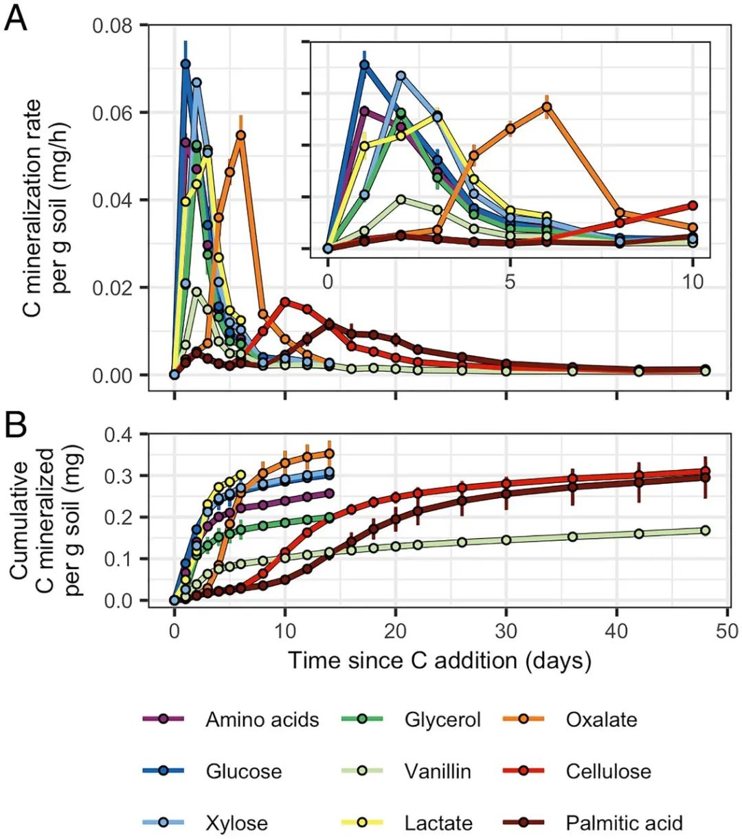 ? ? ? C source mineralization dynamics varied based on bioavailability. (A) 13C mineralization rates and (B) cumulative amounts of 13C mineralized per gram dry weight of soil. (A, Inset) A finer-scale representation of the 13C mineralization rates over days 0 to 10. Error bars represent ± SD among microcosm replicates (n = 3).