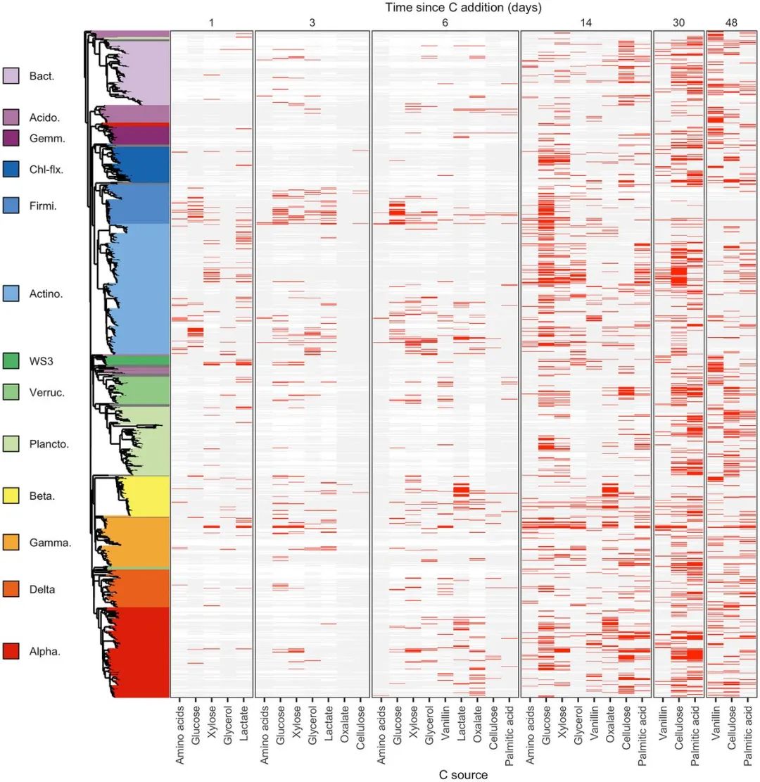 ? ? ? The dynamics of C assimilation varied across the 1,286 OTUs that exhibited significant 13C labeling. OTUs are ordered by their phylogeny with phylum, or class for Proteobacteria, indicated by different colors in the phylogenetic tree. Only phyla/classes with 10 or more 13C-labeled OTUs are colored, with others colored gray. Each vertical block indicates 13C-labeling results for a single day as specified at the top. Each column within a block indicates results for a given substrate as specified along the bottom. Rows display 13C-labeling dynamics for each OTU as follows: red bars indicate 13C-labeling, light gray bars indicate OTU detection in the gradient but no evidence of labeling, white indicates the OTU was not detected in the gradient. Phylum/class abbreviations: Bact. = Bacteroidetes, Acido. = Acidobacteria, Gemm. = Gemmatimonadetes, Chl-flx. = Chloroflexi, Firmi. = Firmicutes, Actino. = Actinobacteria, Verruc. = Verrucomicrobia, Plancto. = Planctomycetes, Beta. = Betaproteobacteria, Gamma. = Gammaproteobacteria, Delta. = Deltaproteobacteria, Alpha. = Alphaproteobacteria.
