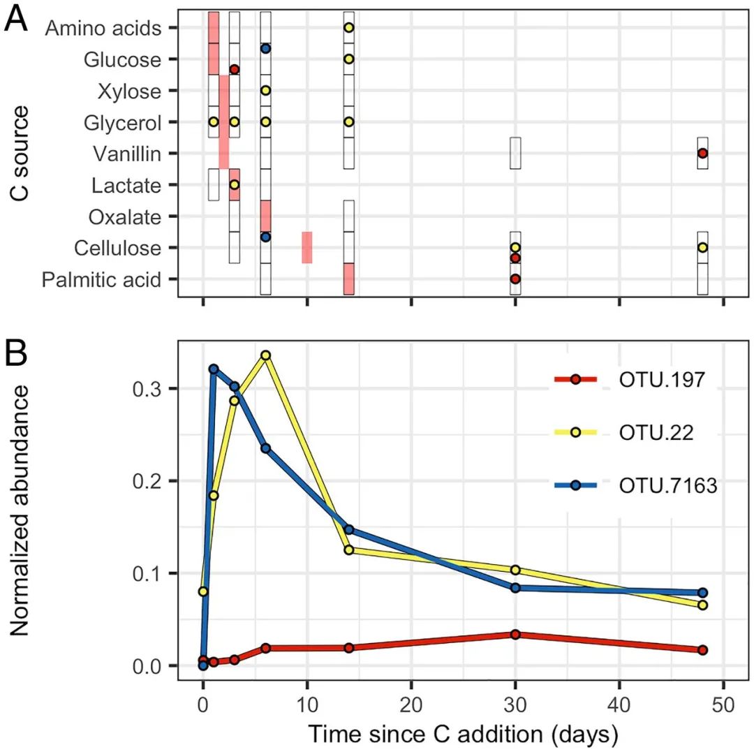 ? ? ? Growth and 13C-labeling dynamics of the most abundant OTUs representing guilds 2 (OTU.197), 14 (OTU.22), and 19 (OTU.7163), which are the guilds most differentiated by PCA (Fig. 5E). (A) The 13C-labeling pattern differs between the three exemplar OTUs. Circles show times when 13C labeling was detected for each substrate and OTU responses are identified by circle color as defined in B. Black rectangles indicate the times when DNA-SIP was performed for each 13C-labeled substrate and red rectangles indicate the time of peak C mineralization for each C source (Fig. 2). (B) Growth dynamics differ between the three exemplar OTUs. Normalized abundance (expressed as micrograms of DNA) is calculated from relative abundance values normalized by rrn copy number and DNA yield.