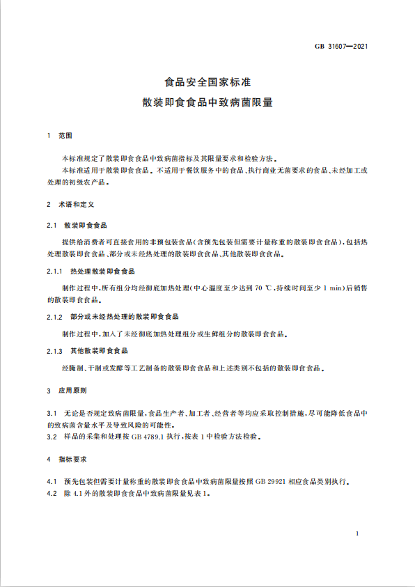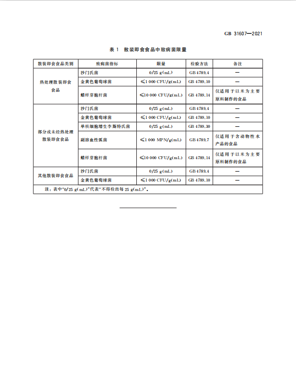 > GB 31607-2021食品安全國家標準 散裝即食食品中致病菌限量