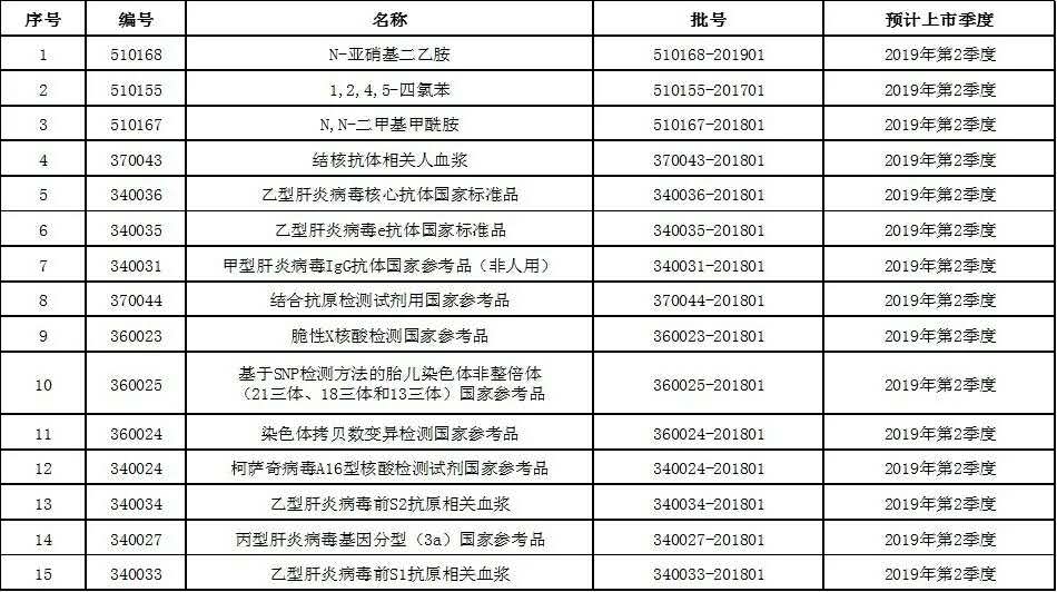 現(xiàn)公布中檢所15個(gè)即將上市的新品種,上市時(shí)間為2019年第二季度,具體情況如下表:
